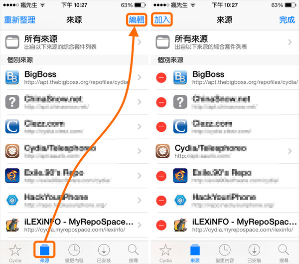 步驟 1.▼ 開啟Cydia,選擇「來源」分類→點選右上角「編輯」,(右圖)在點選「加入」。