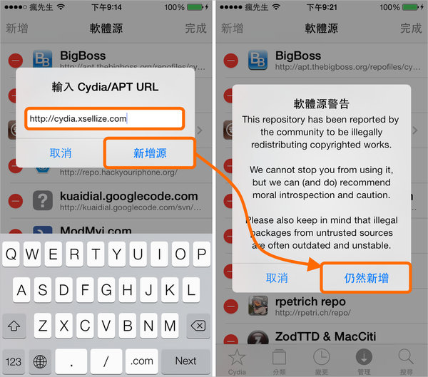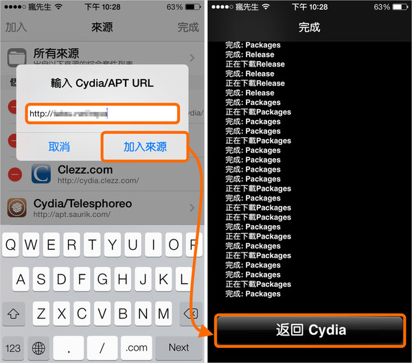 步驟 2.▼ 輸入軟體源網址,在點下添加源即可,如果跳出軟體源警告不用擔心繼續點「仍然新增」,會進行更新軟體源,將軟體源清單都下載到你設備內,等全部下載完成後再點下「回到Cydia」即可完成新增軟體源步驟。