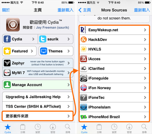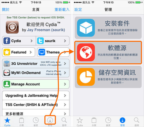 步驟 1.▼ 開啟Cydia,選擇「管理」→點選「軟體源」。