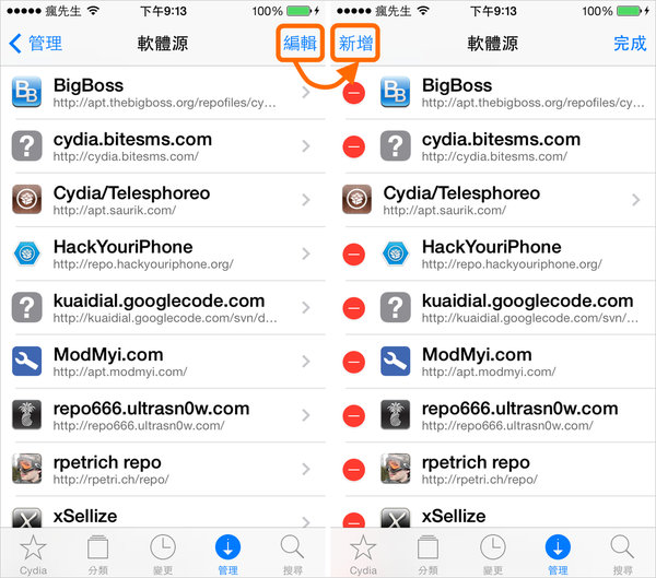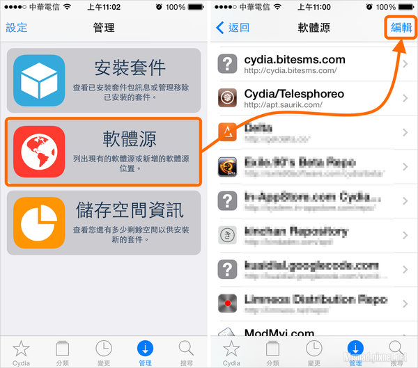 步驟 1. ▼ 開啟Cydia選擇管理頁面,點選上面軟體源選項,會看到加入的軟體源清單請直接點選右上角「編輯」鈕。