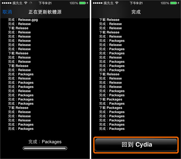 舊版步驟 4. ▼ 會進行更新軟體源,將軟體源清單都下載到你設備內,等全部下載完成後再點下「回到Cydia」即可完成新增軟體源步驟。