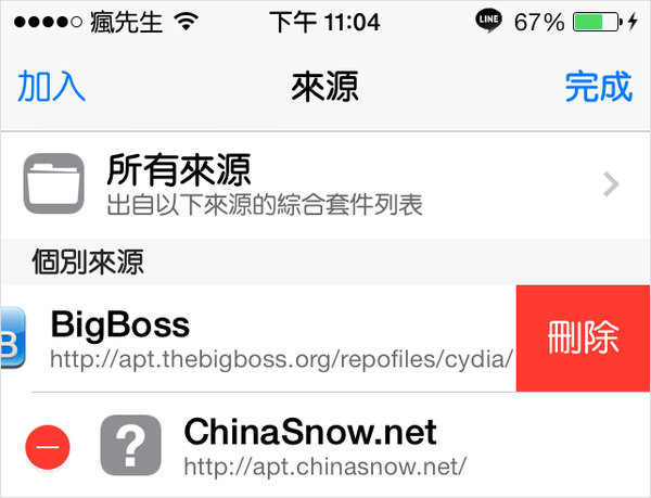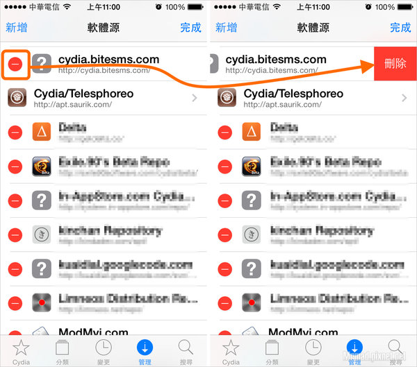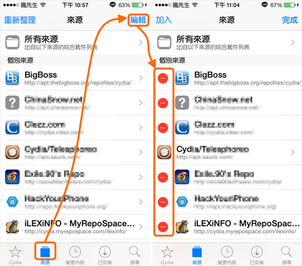 步驟 1.▼ 開啟Cydia,選擇「來源」分類→點選右上角「編輯」,(右圖)這時會出現紅色字「-」的ICON圖示,找到你要刪除的軟體源點一下。