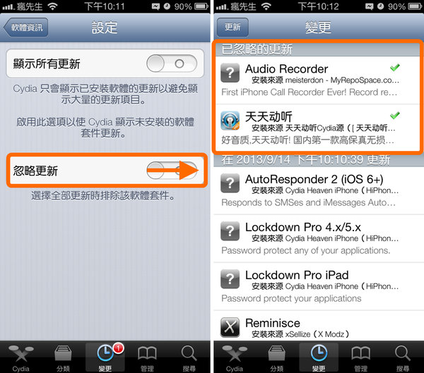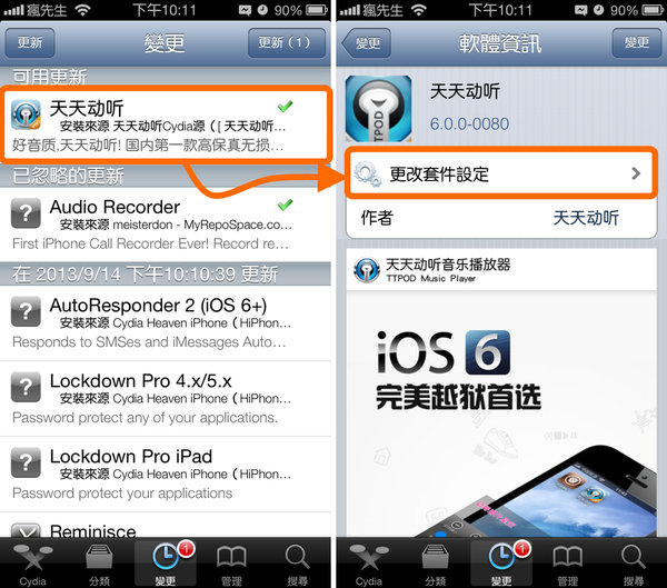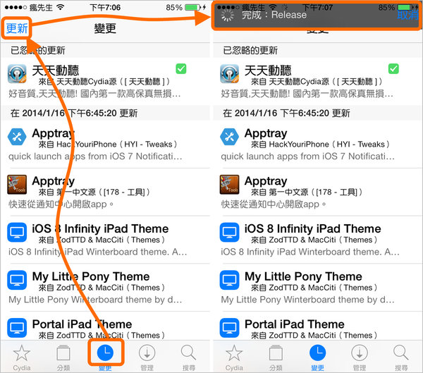 ▼ 開啟「Cydia」選擇「變更」在點選左上角的「更新」,(右圖)等這些資料下載完跑完就能搜尋到瘋先生教學的插件。