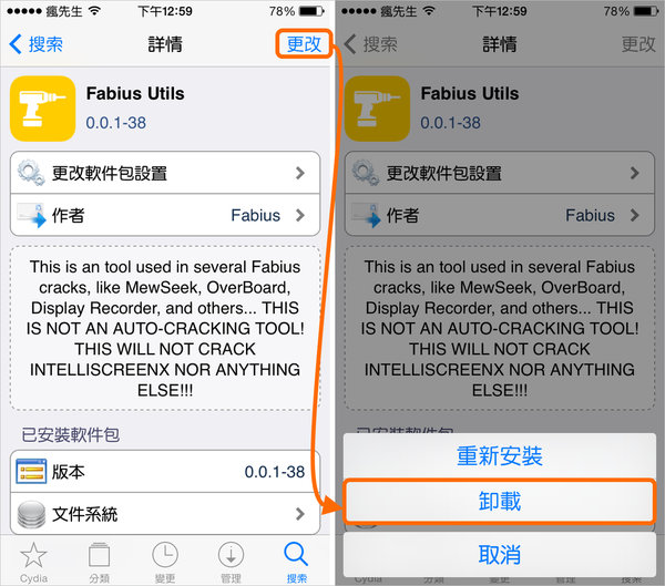 ▼ 如遇到安裝後會導致安全模式或是白蘋果,請盡快將插件移除,移除方法直接搜尋或是點選「管理」內找到「安裝套件」將它尋找要移除的插件,選擇右上角「更改」>「移除」即可。