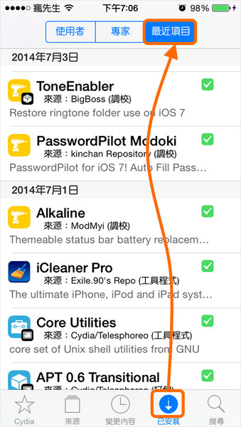 ▼ 如果不清楚最近安裝或更新了什麼,新版Cydia已經加入類似AppStore安裝與更新時間紀錄,點選「已安裝」頁面後,在選擇「最近項目」即可。